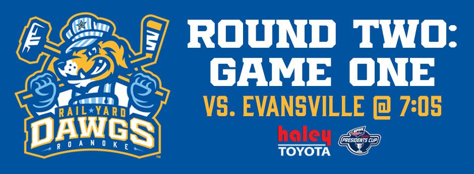 2026 SPHL President's Cup Playoffs - Roanoke Rail Yard Dawgs vs. Evansville Thunderbolts - Round Two: Game Two. Rail Yard Dawgs postseason sponsored by Haley Toyota. Media partner is 94.9 STAR Country FM. Parking is $10 while spaces remain or use free shuttle. Event Updates: https://www.railyarddawgs.com/eventupdates